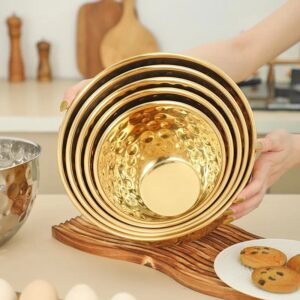 Pack de 5 Bol doré : 16cm/18cm/ 20cm/22cm/24cm Utilisation : Le bol mélangeur en acier inoxydable est idéal pour les hôtels, les restaurants, les maisons ou les événements en plein air tels que les pique-niques et les campings. Avec sa conception empilable, vous pouvez économiser de l’espace dans votre cuisine et obtenir une zone de cuisson propre. Design unique : la surface présente un motif martelé qui ajoute une touche esthétique à la vie quotidienne. Comparé aux bols en céramique, il est léger mais robuste Matériau de qualité supérieure : Saladier en acier inoxydable épaissi, incassable, facile à nettoyer, sûr et résistant à la rouille. Élégant et fonctionnel : le bol de service en acier inoxydable n’est pas seulement un ustensile de cuisine, mais un compagnon pour ces où vous savourez des repas soigneusement cuisinés avec vos proches.